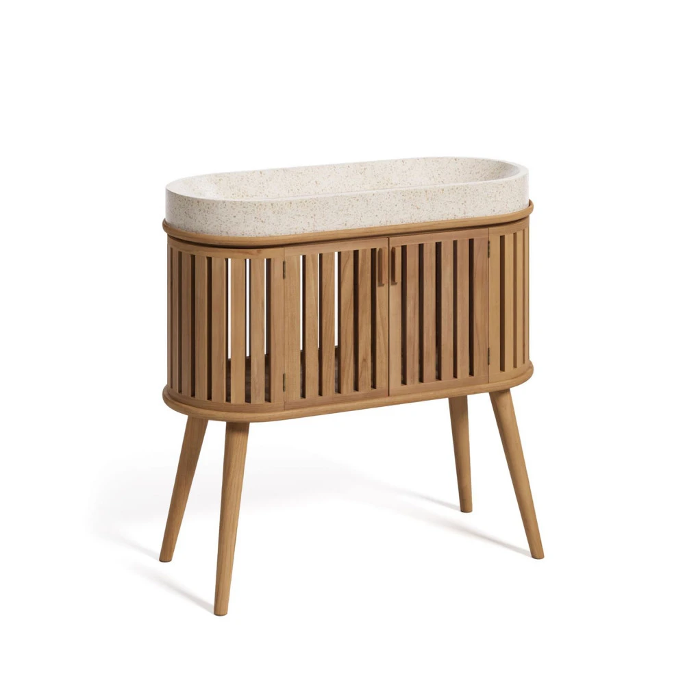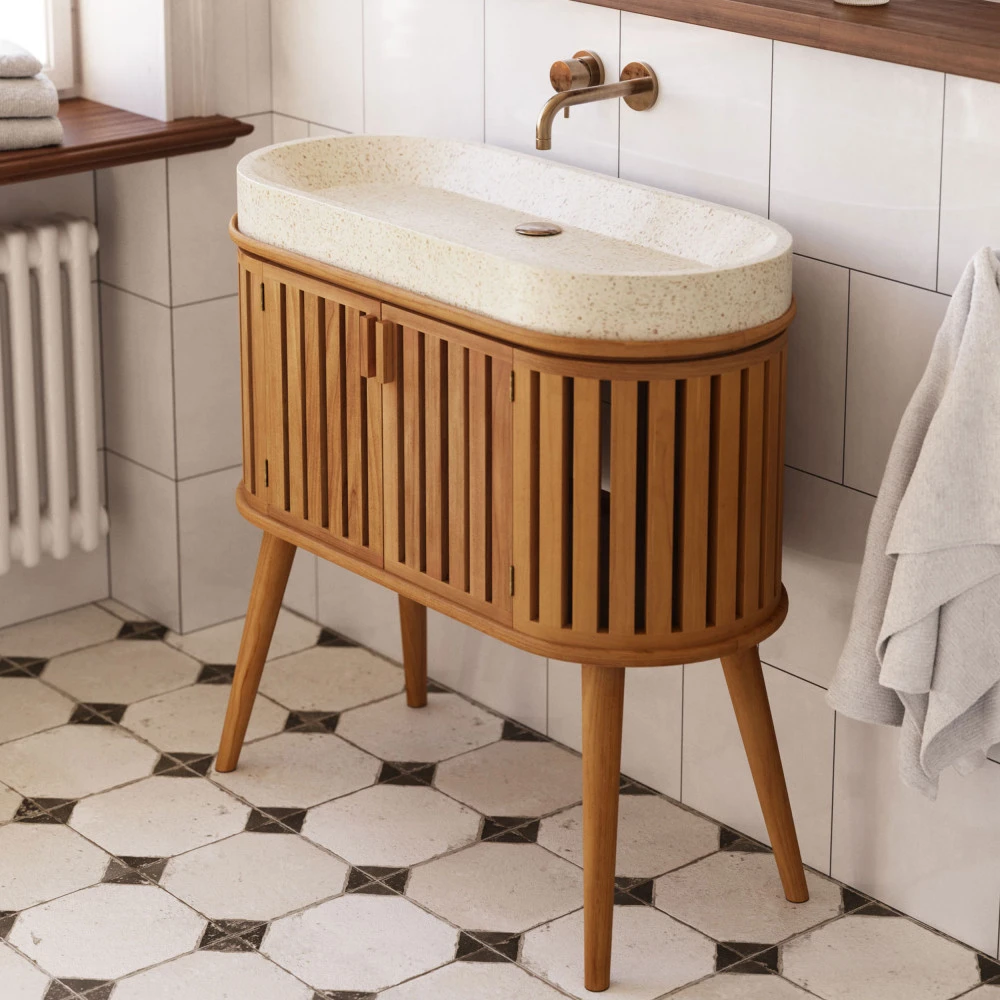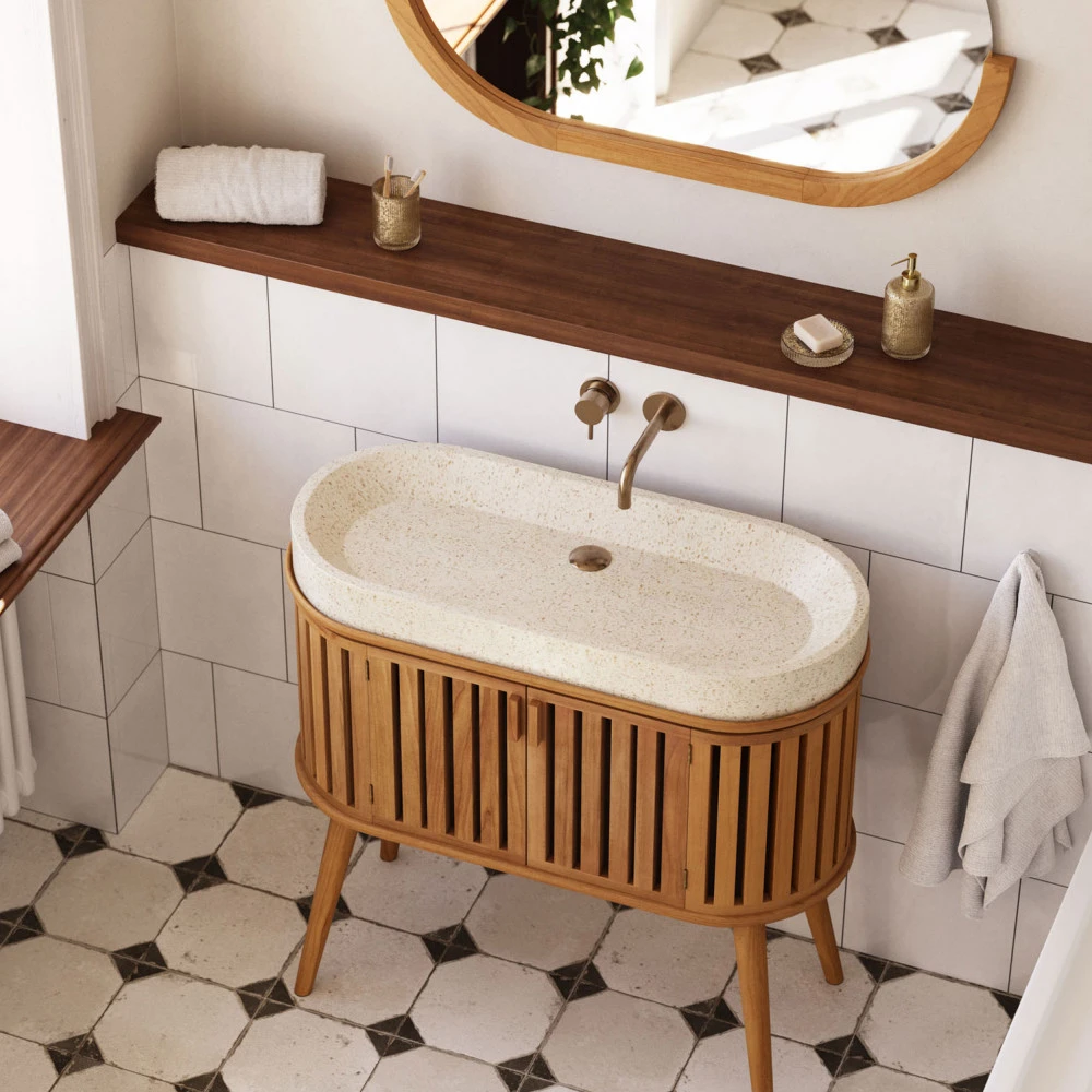 Ce meuble est coiffé d’une vasque en terrazzo ovale qui s’encastre parfaitement dans le meuble du dessous, donnant ainsi une impression de mobilier fait sur mesure. Comptez sur cette forme plutôt atypique pour ajouter du cachet à votre pièce ! Cette vasque affiche des coloris neutres et naturels qui mettront en valeur la teinte claire du bois de teck utilisé pour la conception du meuble. Les tonalités et textures pouvant varier d’un modèle à l’autre, attendez-vous à ce que votre exemplaire soit unique.