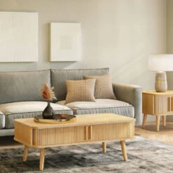 En plus de son côté astucieux, on apprécie le design de cette table basse. Conçue en mélaminé, elle se dote de bords arrondis qui adoucissent sa forme rectangulaire classique. On aime aussi sa finition à lattes, très élégante, et ses pieds inclinés en bois massif de chêne qui allègent l’ensemble et compensent le côté boîte du rangement.