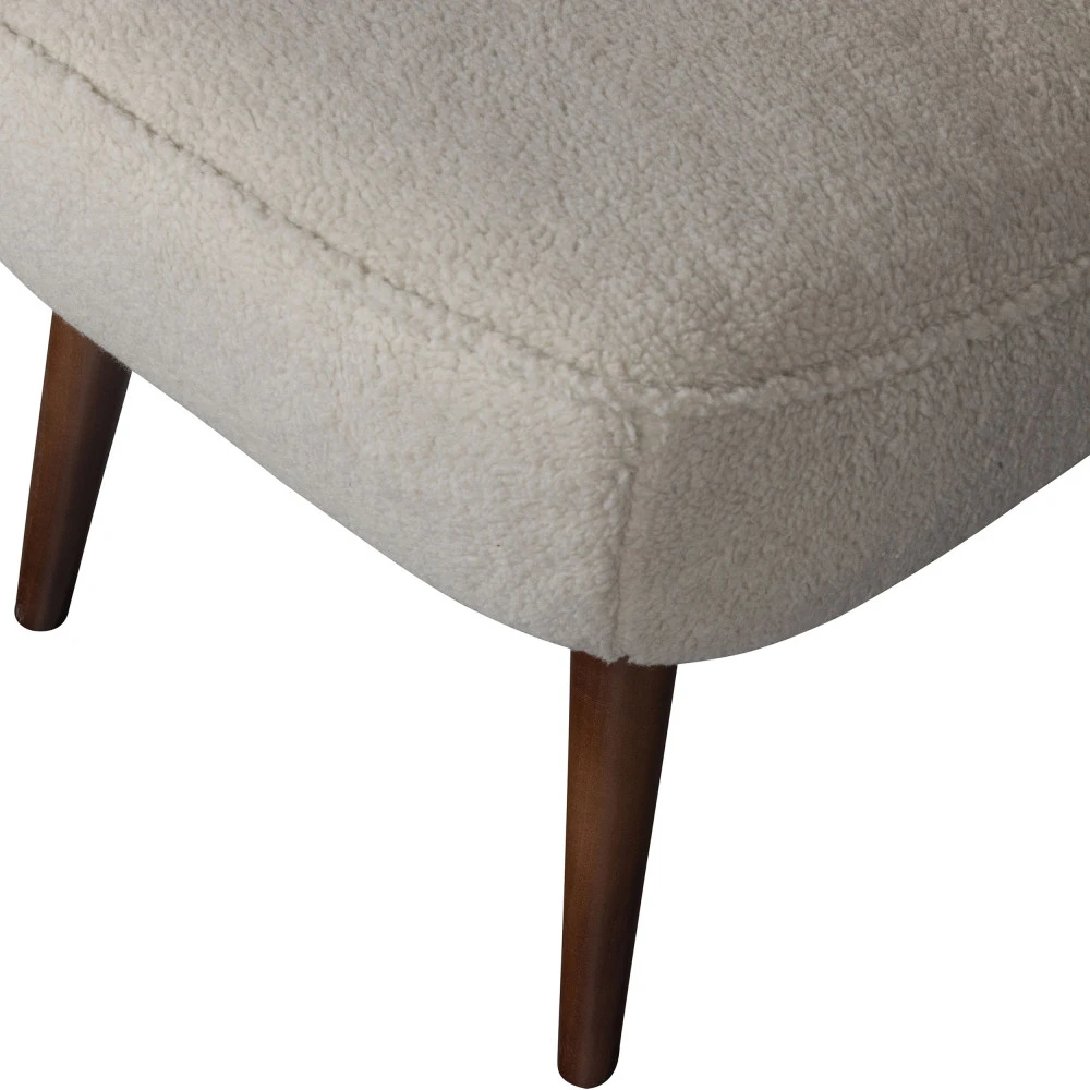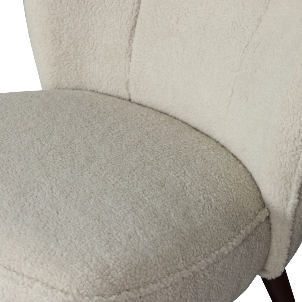 Le coup de cœur, c’est son tissu ! Il est conçu dans un revêtement 100% polyester à l’aspect peau de mouton, pure tendance et proposé dans un coloris blanc cassé lumineux parfait pour les intérieurs au style nature. Sa structure est solidement construite en bois, avec des pieds en bois de bouleau au coloris brun naturel. Sa forme épouse le dos et offre une assise confortable, à la bonne hauteur.