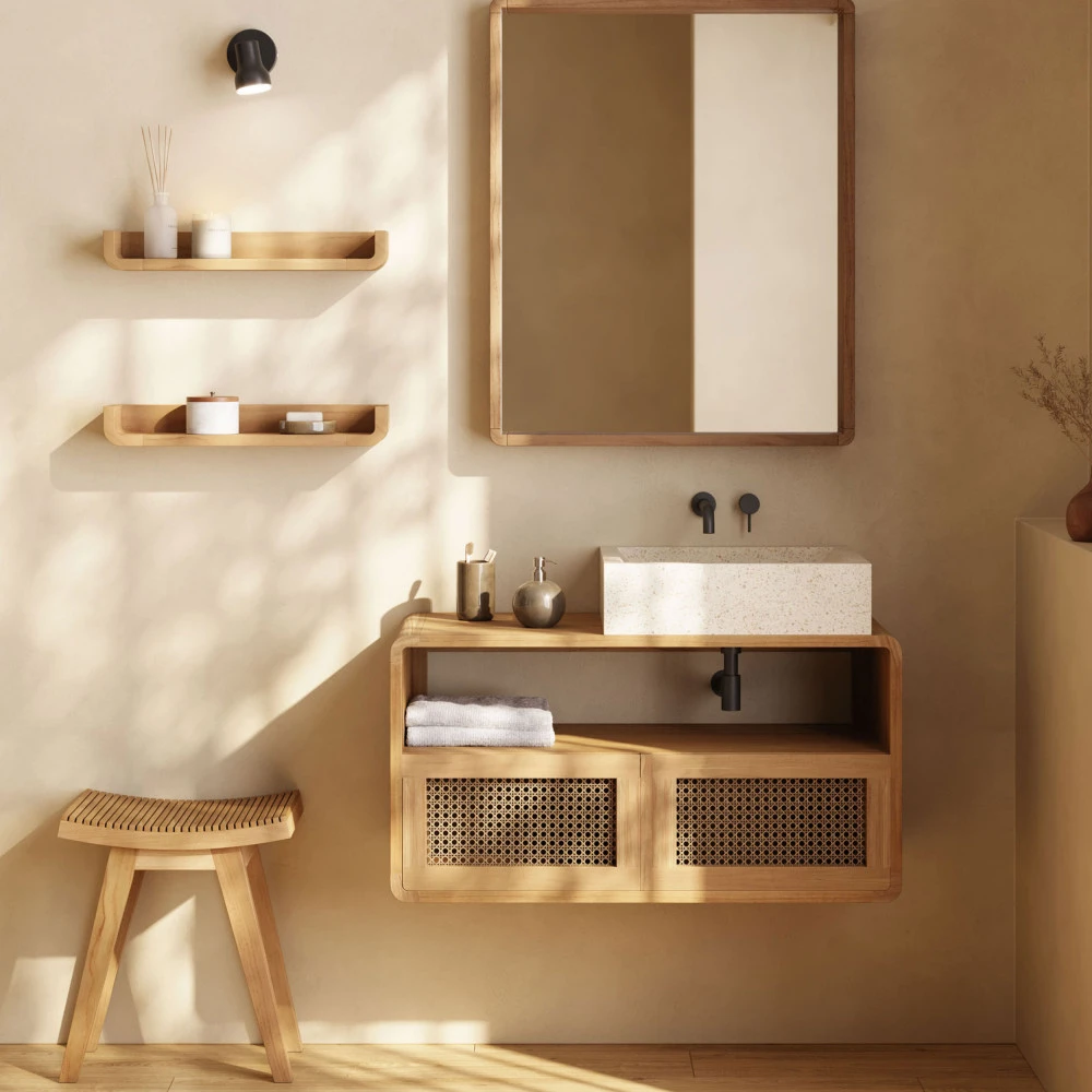 Chacune mesure 5 cm de hauteur, 50 cm de largeur et 12 cm de profondeur. Elles affichent un look bohème que vous pourrez marier avec un grand nombre de couleurs et de matériaux même si on a un petit faible pour les matières naturelles : jute, jonc, bois, cannage, lin, etc. Ensemble, ils formeront un rendu très harmonieux avec l’encadrement en bois de teck dont les tonalités et les textures varient d’un modèle à l’autre.