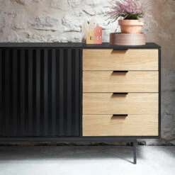 Conçu en bois MDF laqué mat, ce buffet design mesure 79,6 cm en hauteur, 159,2 cm en largeur et 47 cm en profondeur. Il est pourvu de 4 tiroirs sur la droite puis d’espaces de rangement avec étagères fermés par 2 portes côté gauche. Des pieds fins en métal assurent sa stabilité et allègent l’ensemble. On aime l’élégante finition striée des portes ainsi que les poignées de tiroirs plates, très modernes.