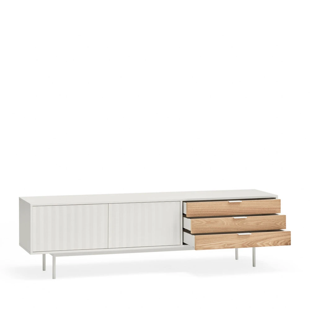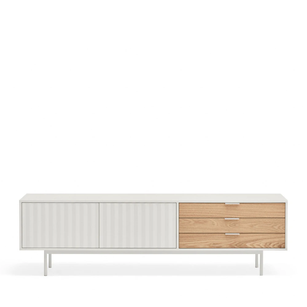 Ce meuble confectionnĂ© en mĂ©dium est intrigant : il est dĂ©coupĂ© en 2 parties de styles diffĂ©rents. En partie gauche et centrale, vous trouverez des espaces de rangement fermĂ©s par 2 portes Ă la finition striĂ©e, dans un style très contemporain, tandis qu’en partie droite, vous avez lĂ 3 tiroirs contrastĂ©s, avec de fines poignĂ©es longues, dans un style plutĂ´t scandinave. IntĂ©ressant, ce mĂ©lange des 2, vous ne trouvez pas ?