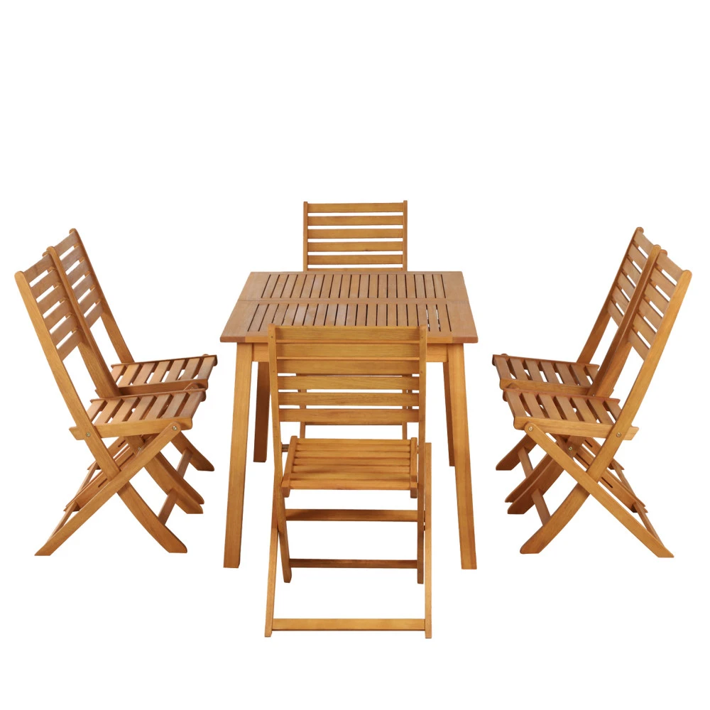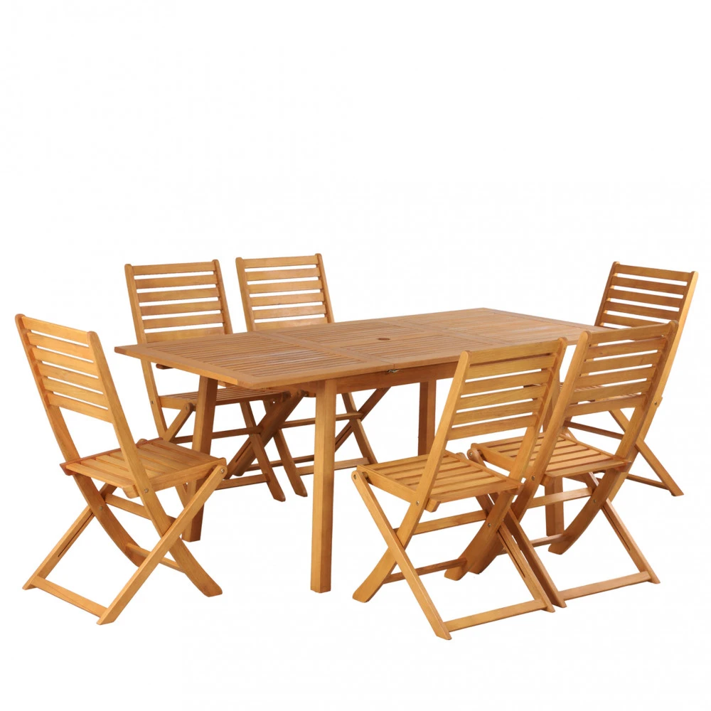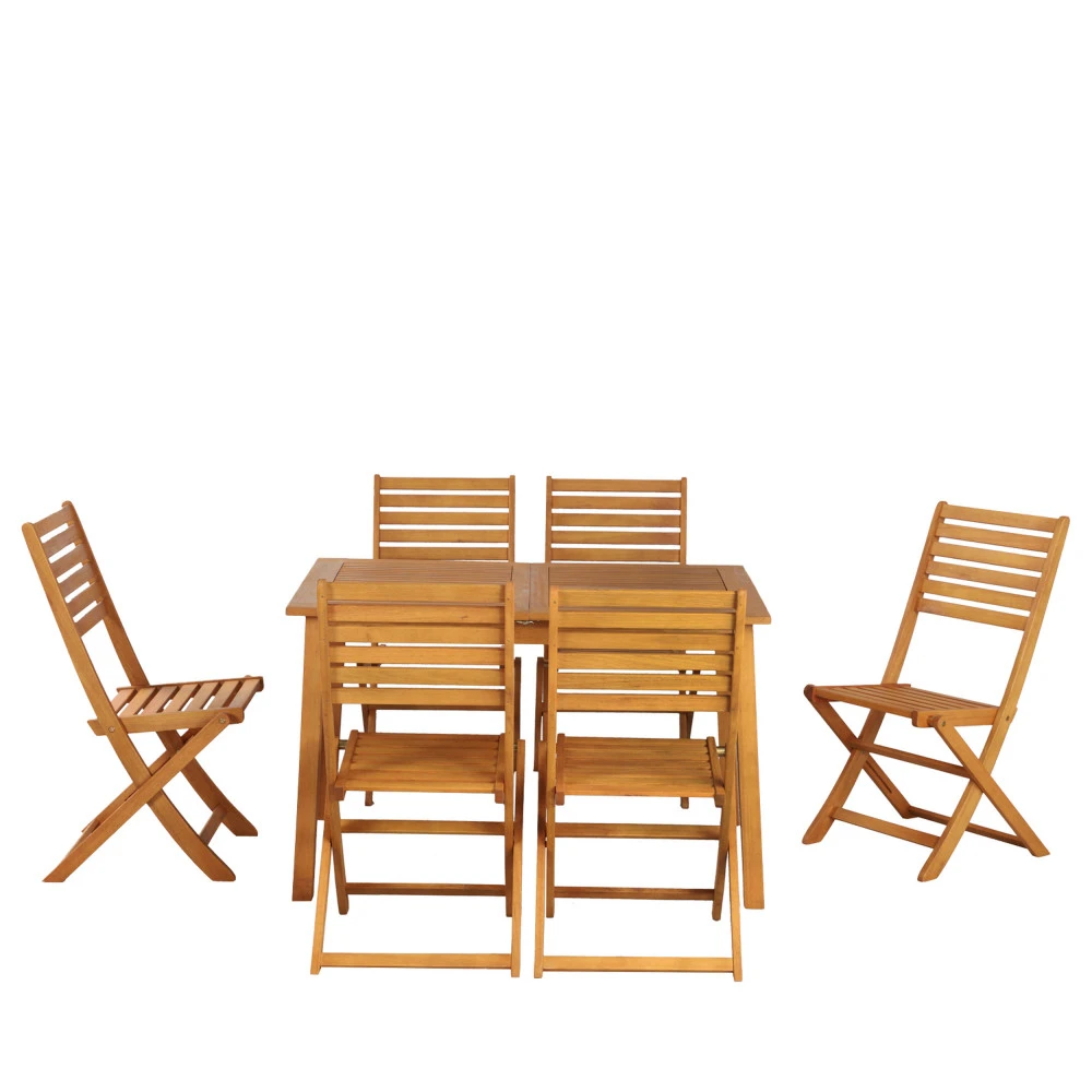 Cet ensemble de jardin se compose d’une table extensible et de 6 chaises en bois. Le plateau mesure 80 cm de profondeur et 120 cm de largeur, mais une fois la rallonge dépliée, celui-ci gagne 40 cm pour atteindre 180 cm de largeur et tout cela en 30 secondes chrono ! On est complètement séduit par cet ensemble de jardin qui permet à la fois d’optimiser son extérieur tout en lui donnant un charme scandinave. Toujours dans une optique de gain d’espace et pour faciliter le rangement à l’approche de l’hiver, cet ensemble repas est équipé de chaises pliables.