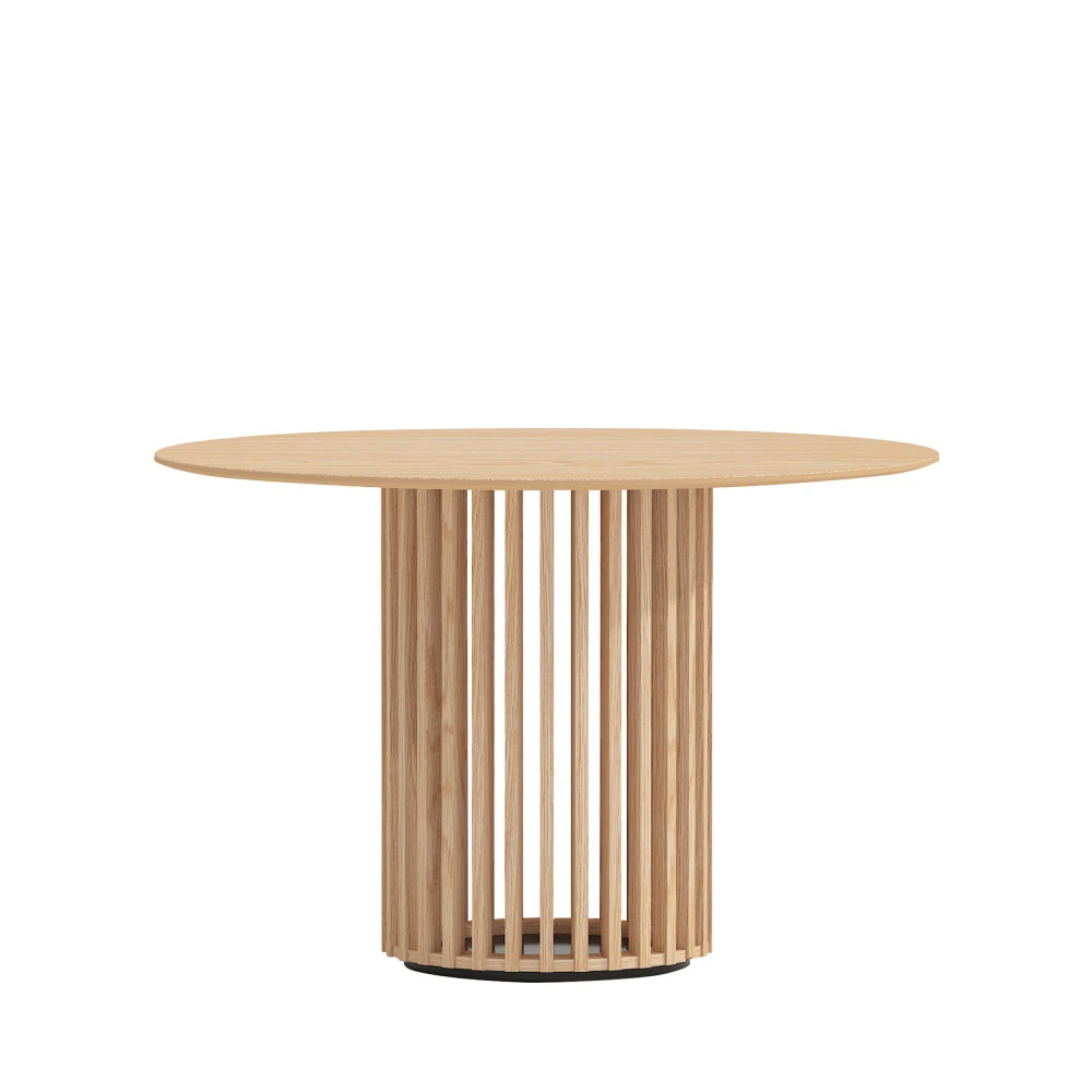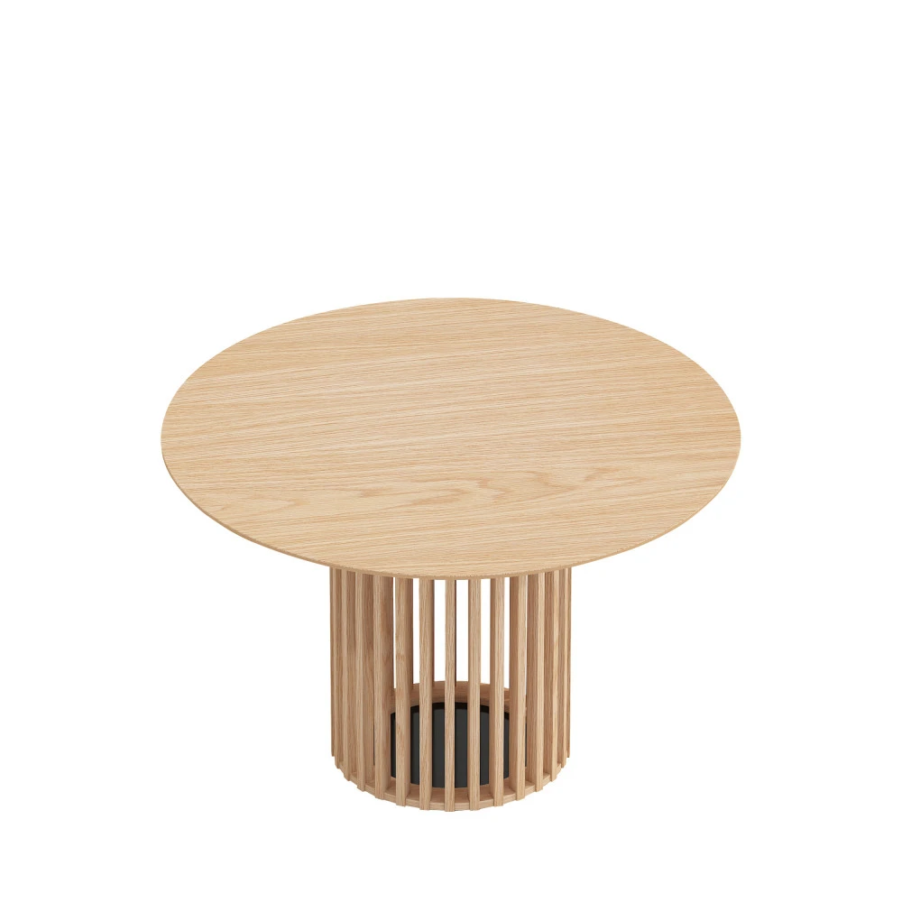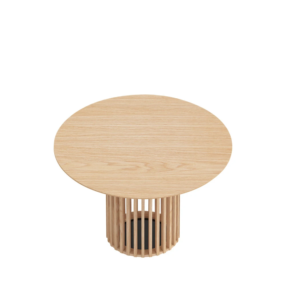 Doté d’un plateau rond classique plutôt fin et confectionné en MDF, ce modèle prouve toute son originalité à travers son piètement en bois massif de chêne. Il s’agit d’un pied central ajouré, composé d’une multitude de barreaux. Le résultat est très moderne, plutôt graphique, élégant et bien pensé. Vous aimez ?