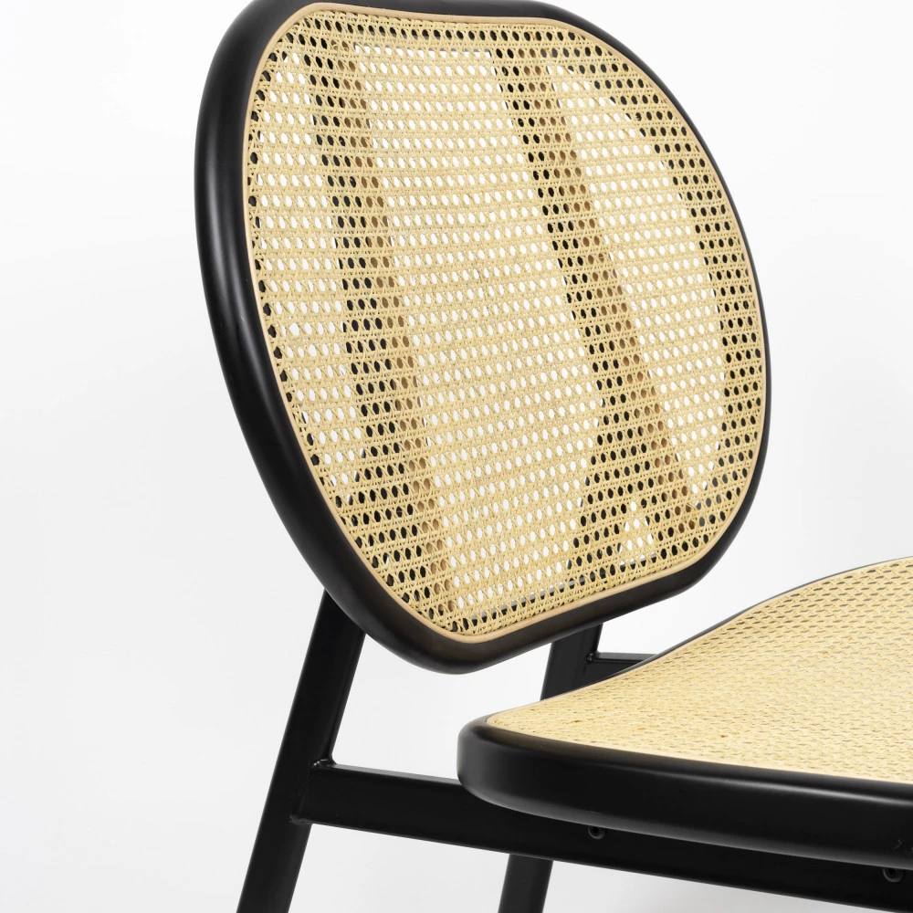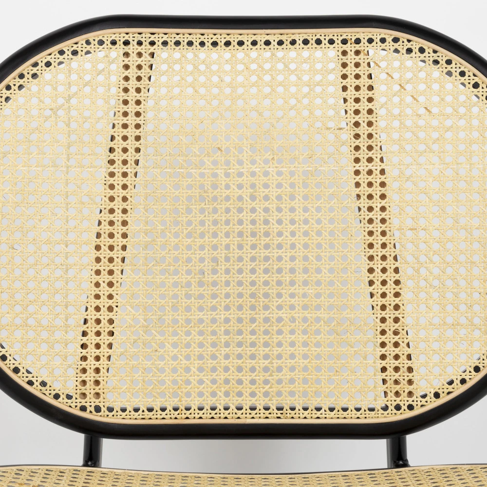 Ce fauteuil design mesure 84,1 x 78,6 x 70 cm. Il est doté d’un piètement en métal et d’une assise et d’un dossier en cannage cerclés de métal. Il présente de simples lignes recherchées à la fois. On aime son look esprit chaise large basse.