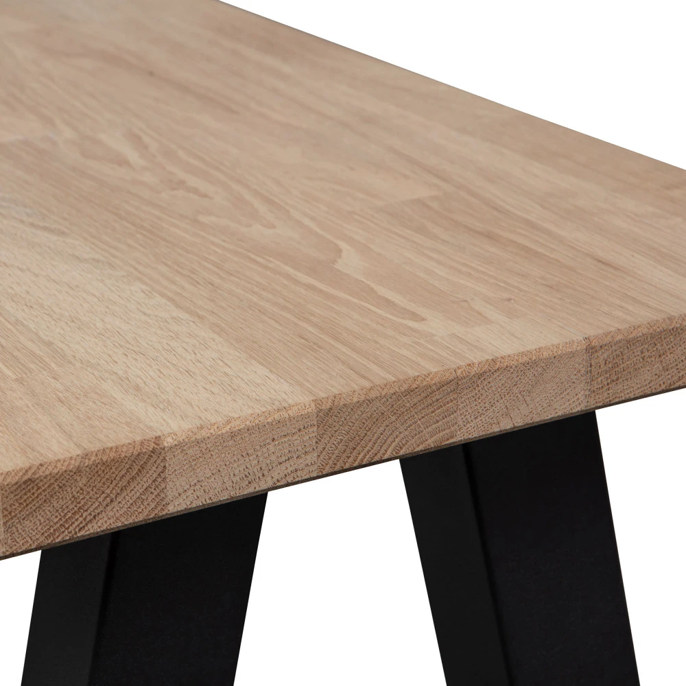 Trois personnes pourront donc s’y asseoir confortablement. La partie inférieure se compose de 4 pieds évasés placés aux extrémités, garants d’une excellente stabilité. Le contraste du bois et du métal noir mat offre un rendu au style résolument contemporain.