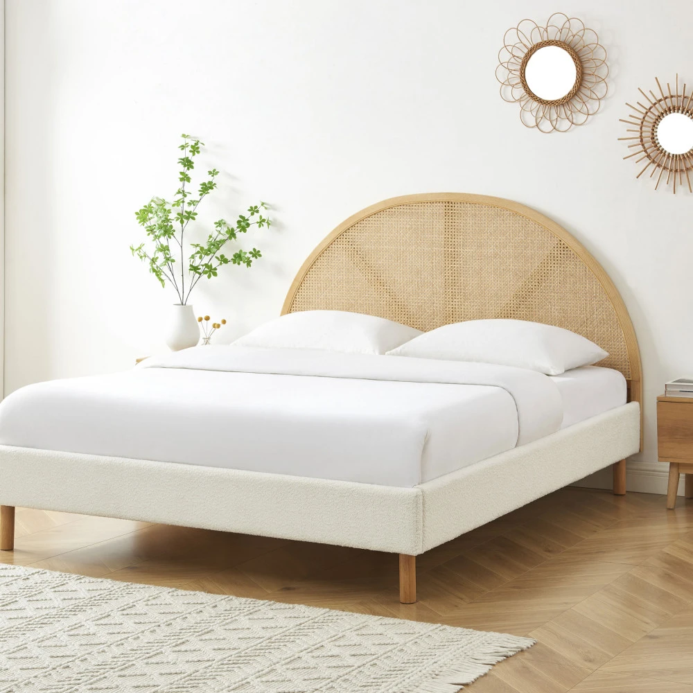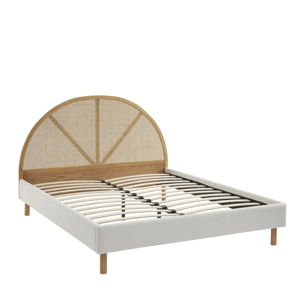 Chez Drawer, on aime beaucoup les éléments de mobilier bi-matière, comme ce lit design. Ce modèle se dote d’une structure en bois et contreplaqué, avec un revêtement en tissu bouclette autour du cadre, une tête de lit arrondie en chêne et cannage rotin ainsi que des pieds en bois massif d’hévéa. L’ensemble est superbe, vous ne trouvez pas ? La bouclette et le rotin sont des matières très tendance depuis quelques saisons, et sont parfaits tous les deux pour une déco bohème. Cette tête de lit est très élégante, avec une petite note rétro qu’on aime bien, et la bouclette vient adoucir le bois brut.