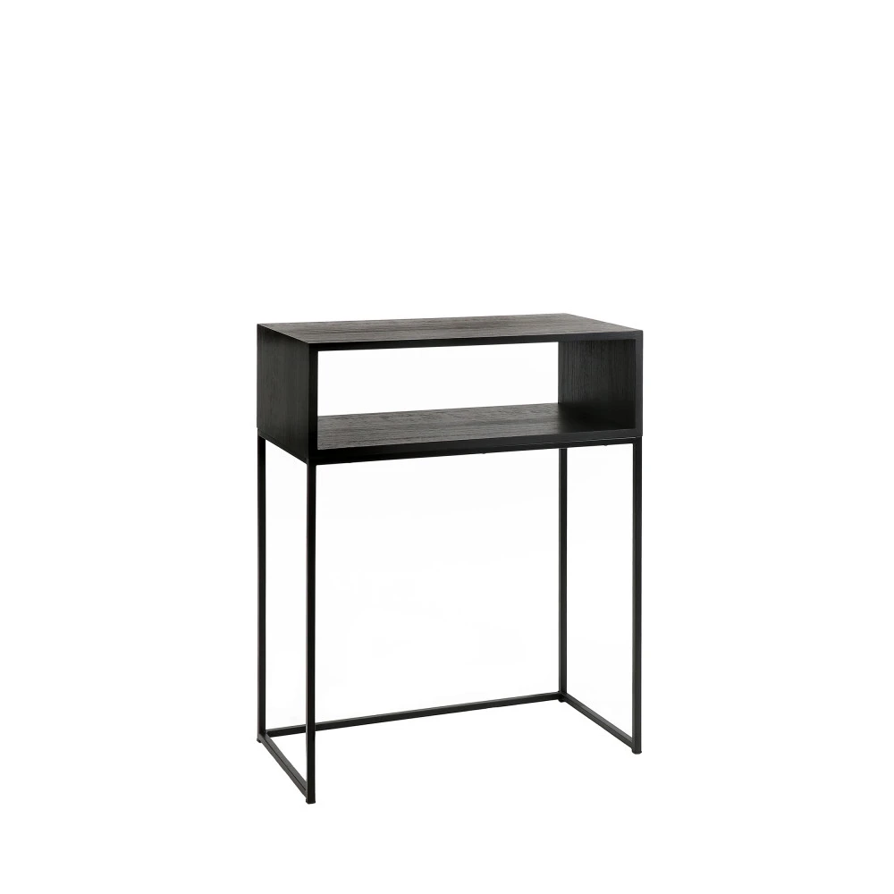 L’association du bois et du piètement en métal noir crée une belle harmonie, pour un style aux subtils accents industriels. La partie supérieure en bois noir offre un rangement pratique et spacieux, tandis que la base, tout en finesse, joue sur une légère asymétrie. Pour protéger vos sols des rayures, nous vous recommandons l’usage de petits patins en feutre sous ses pieds.