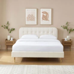avec ses lignes simples et sa tête de lit rectangulaire matelassée à bords arrondis, ce modèle est à la fois contemporain, cosy et bohème, avec une petite note chic et glamour apportée par les chaussettes en laiton au niveau des pieds.