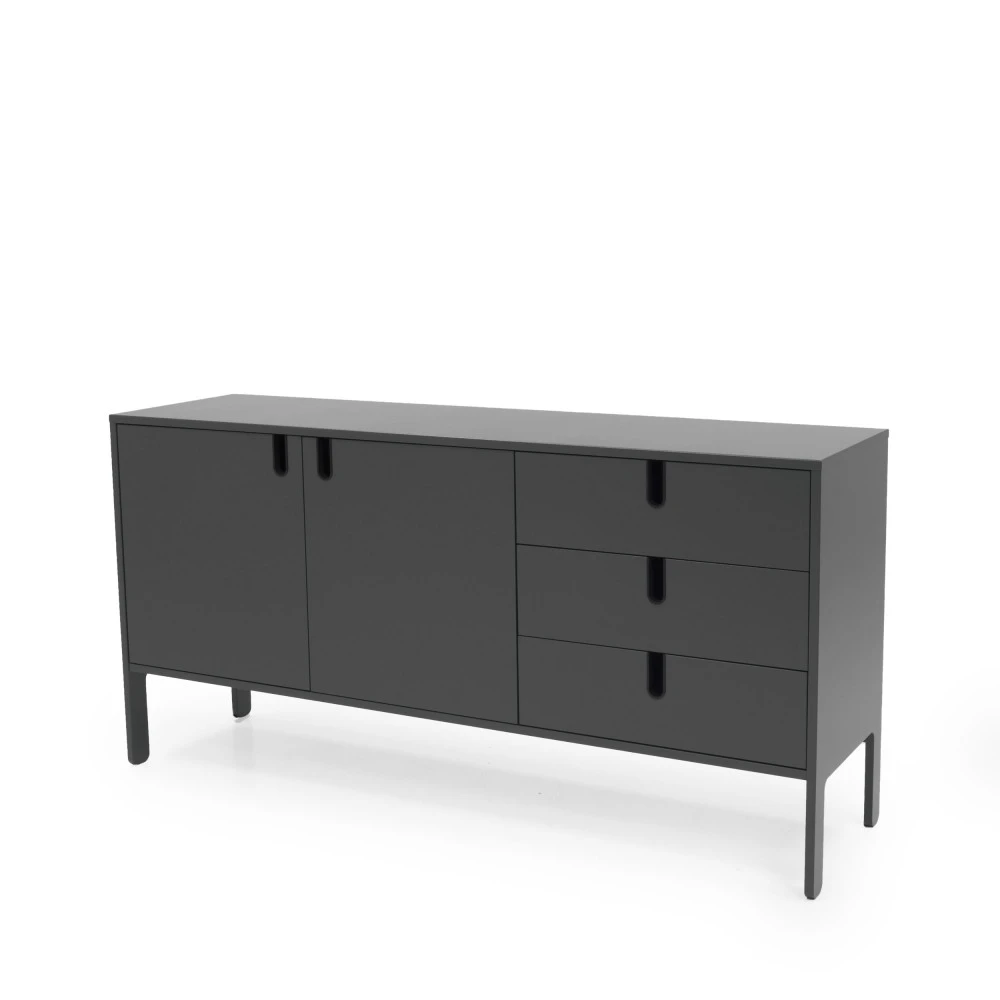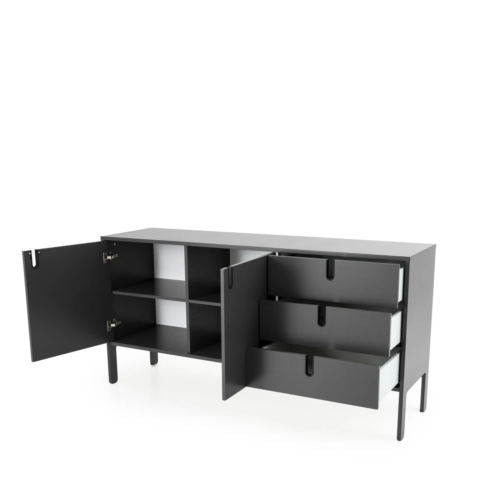 Fonctionnel, ce buffet en bois 2 portes 3 tiroirs L171 cm Uno propose des espaces de rangement généreux. Derrière chaque porte on peut trouver des niches avec des dimensions de H58xL51,5xP43,5 cm et chaque tiroir offre un espace de rangement de H12,5xL56xP36,5 cm. Difficile de manquer de place pour stocker la vaisselle, les livres ou le linge de maison !