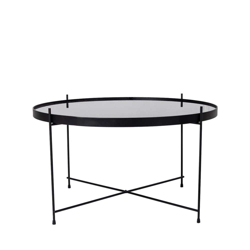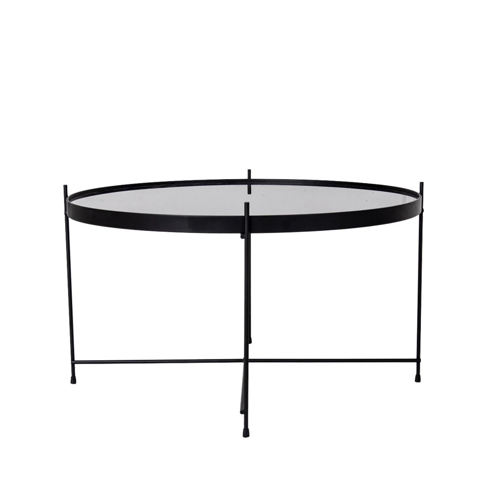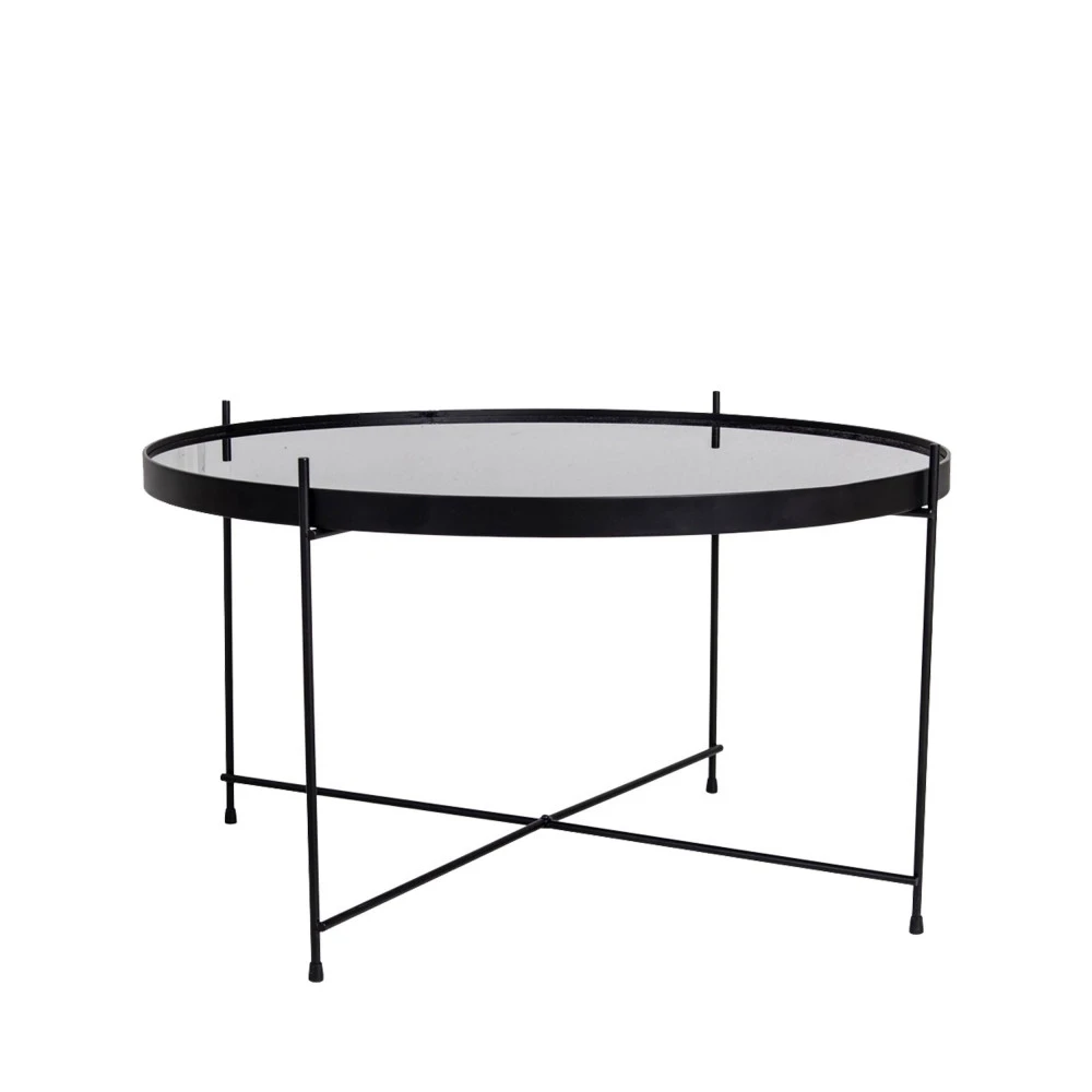 Bi-matière, cette table basse de 40 cm de hauteur est composée d’un plateau rond en verre de 70 cm de diamètre encerclé de métal et pourvue de pieds très fins en métal croisés sur la base. Avec ses pieds dépassant du plateau, ce meuble offre un design réellement moderne.